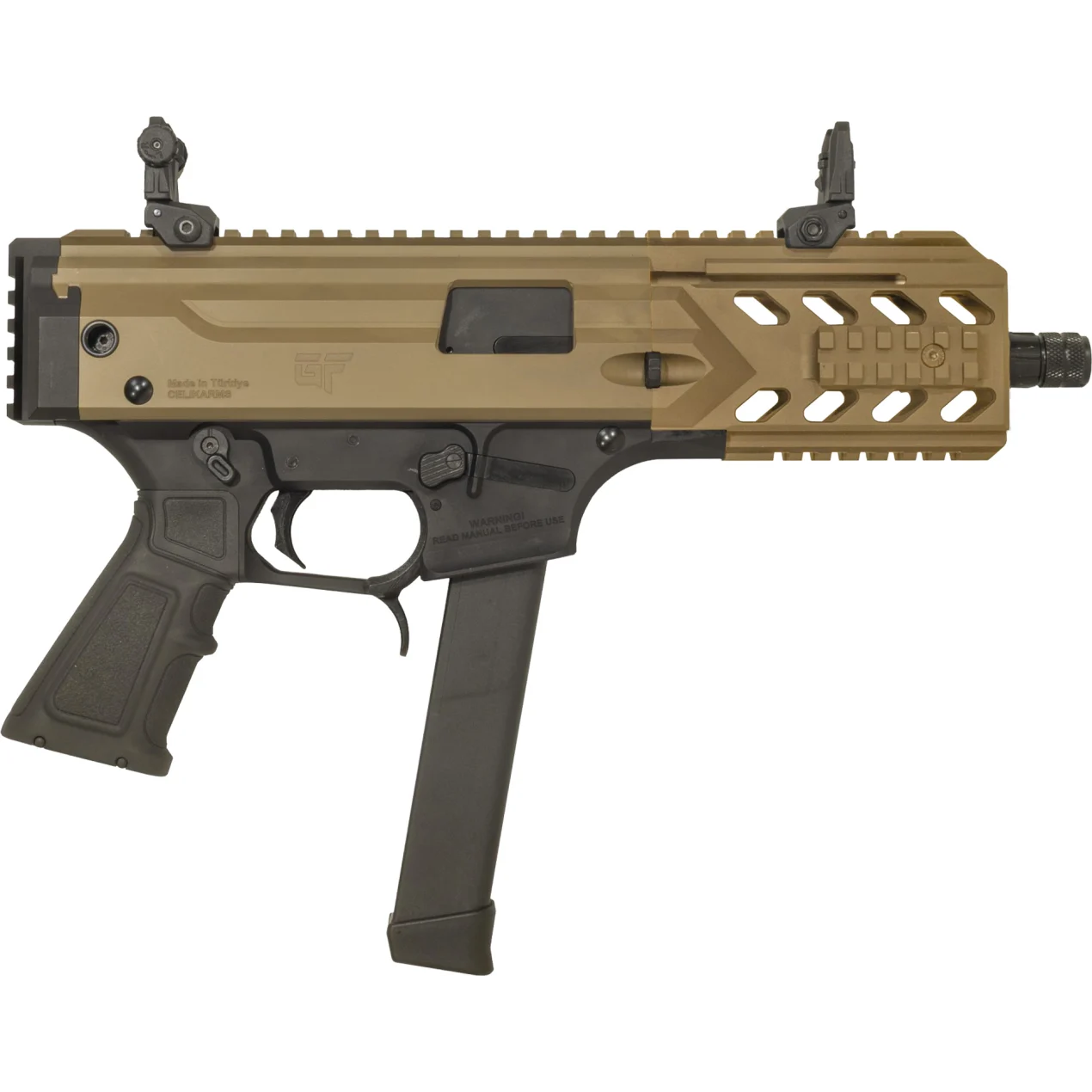 The GForce Arms BLADE model is a 9mm blow back pistol that utilizes GLOCK 19/17/34 magazines. The BLADE comes with one 33 round magazine and a limited lifetime warranty. The 1913 picatinny adapter on the back of the BLADE enables the shooter to install various pistol braces, or stocks in the case of converting the pistol into an SBR with a legal ATF Form 1 application.