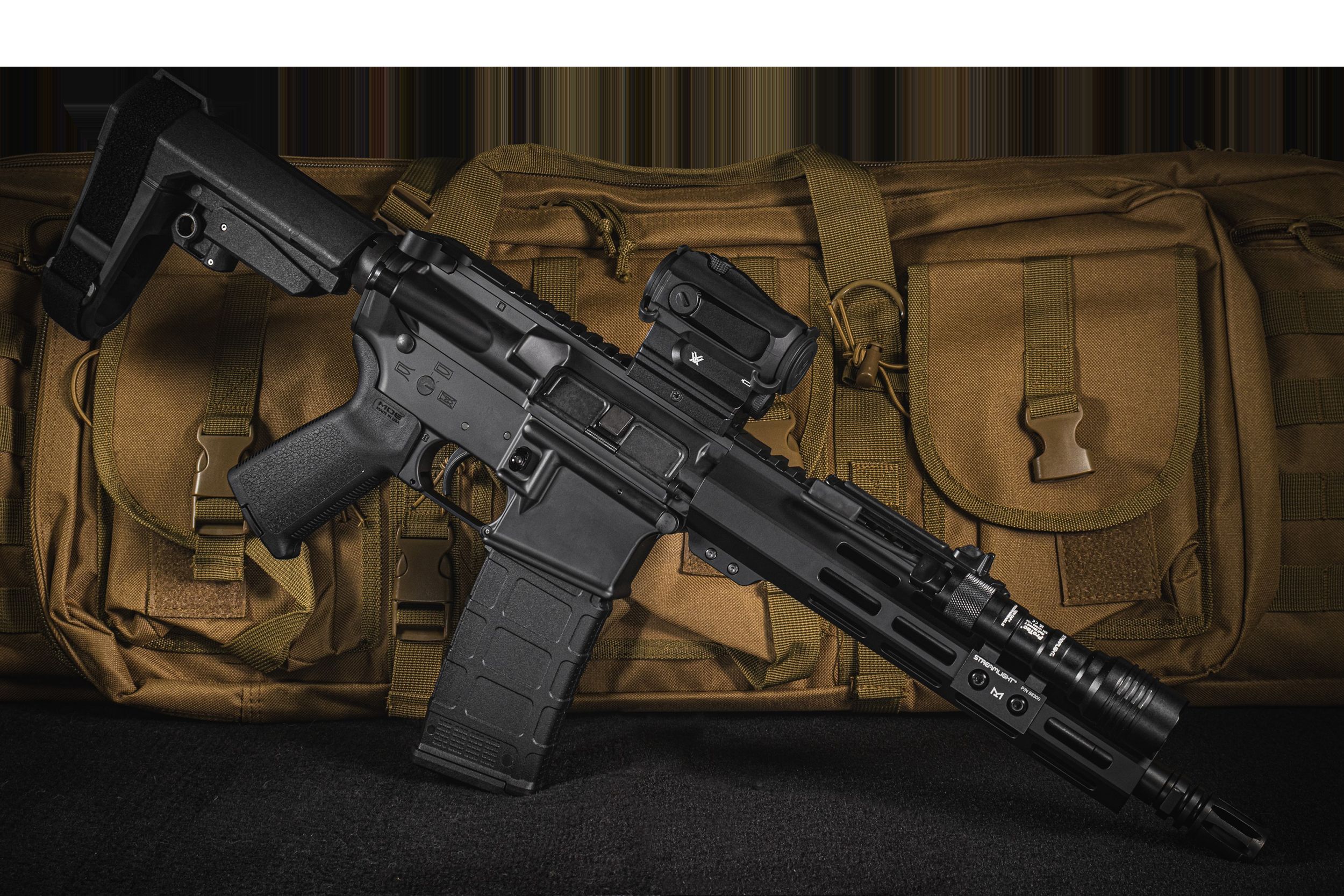 The Midnight pistol bundle by Shark Coast Tactical features a black Cerakote finish; 5.56 NATO with a CMV Melonite threaded barrel; Magpul stock and grip. Bundle includes magazine, Vortex Sprax red dot, rifle bag, Streamlight ProTac Rail Light and pressure pad.