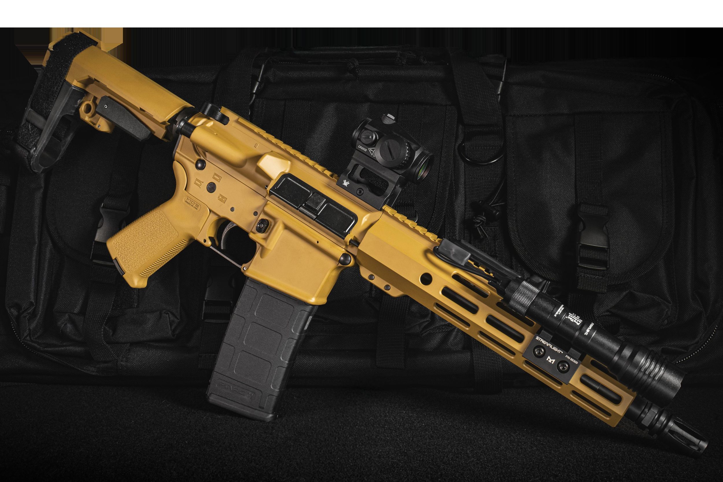 The RAL pistol bundle by Shark Coast Tactical features a RAL Cerakote finish; 5.56 NATO with a CMV Melonite threaded barrel; Magpul stock and grip. Bundle includes magazine, Vortex Sprax red dot, rifle bag, Streamlight ProTac Rail Light and pressure pad.